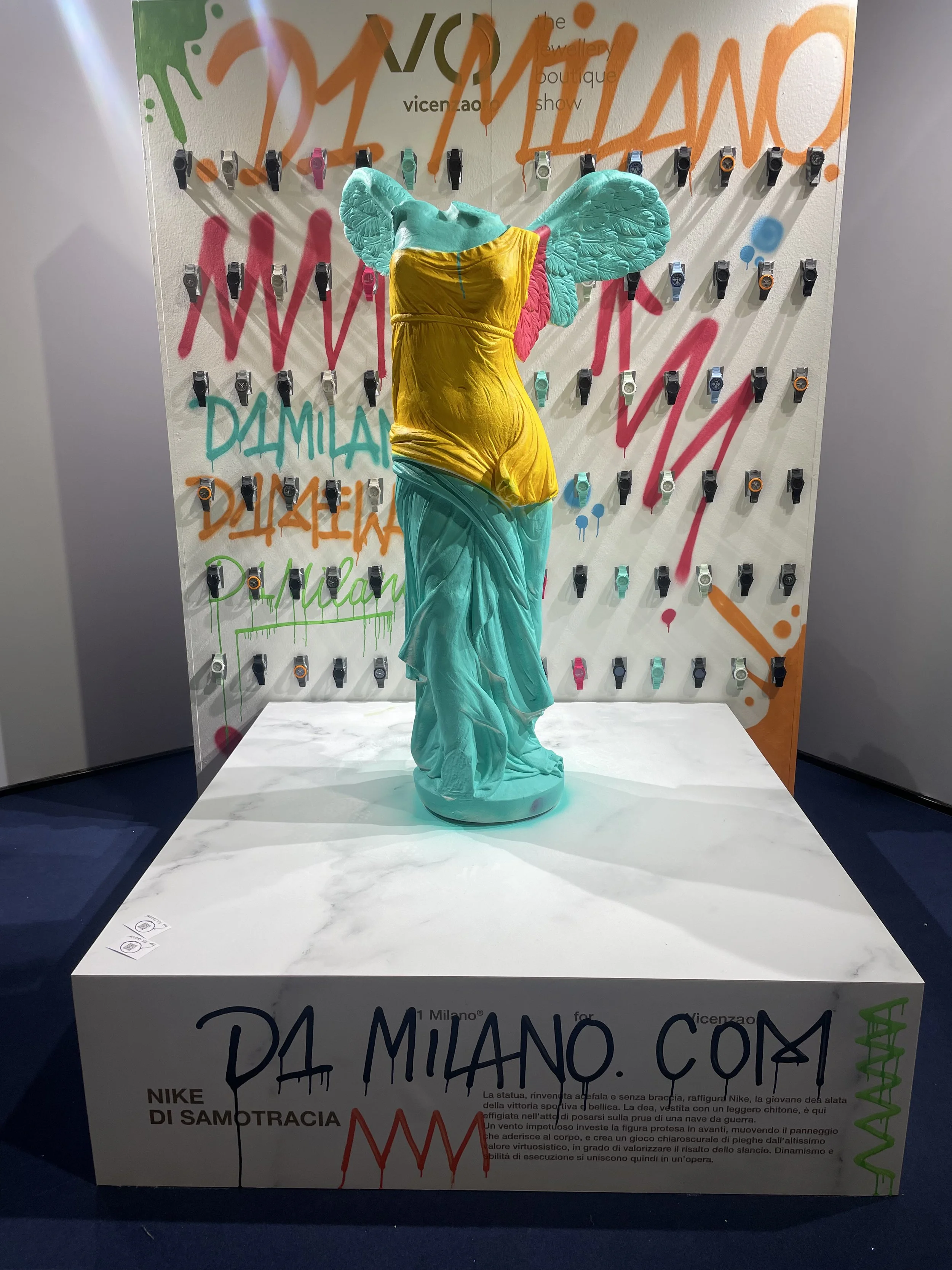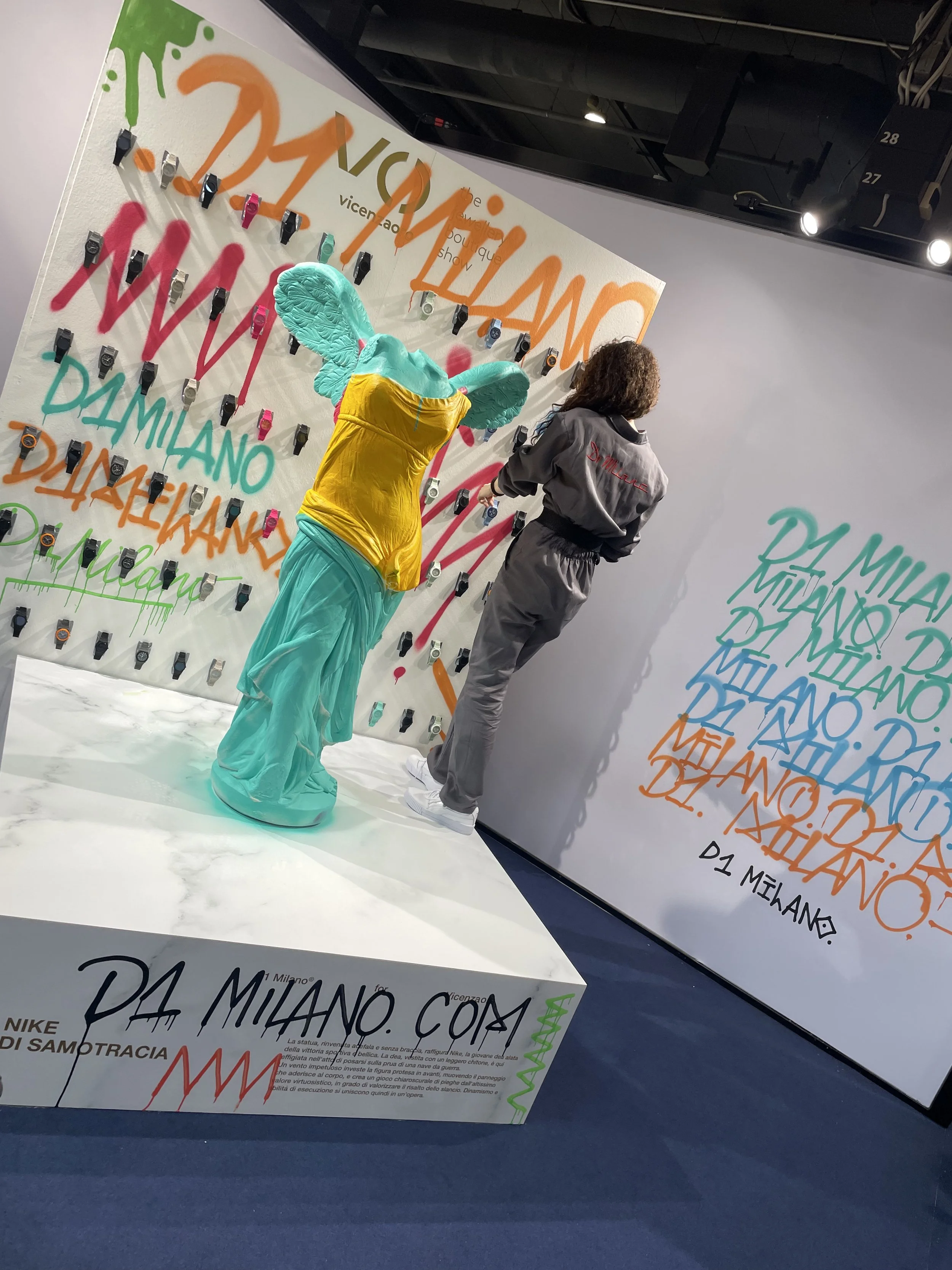 A flashmob style activation commissioned by the watch brand D1 Milano for the world renowned VicenzaOro Gold Fair. A group of Art Activists and Street Artists transformed a statue of the winged Nike into a colourful celebration of creativity. Actors dressed in overalls and balaclavas surrounded the statue as design and street art collective Outline Studio painted the artwork and the backdrop.